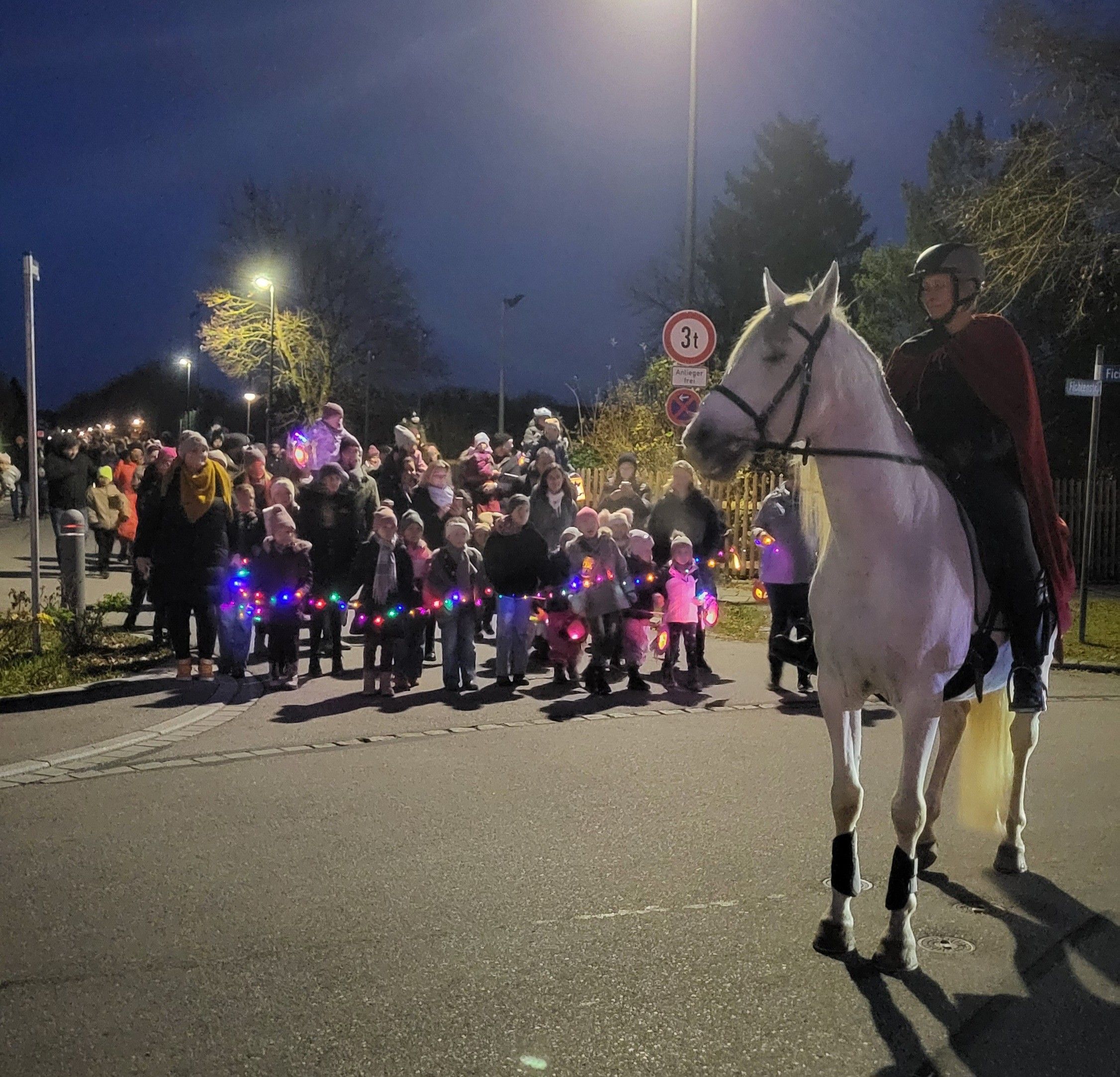 Im Anschluss zogen die Mädchen und Buben mit ihren leuchtenden Laternen los, angeführt von einem „echten Martin hoch zu Ross“. Wieder zurück im Kinderhaus roch es schon nach leckerem Punsch und frischen Würstln. Herzlichen Dank an unseren fleißigen Elternbeirat für die Verpflegung, an die Feuerwehr Hofolding für die Sicherung und an Frau Birgitt Weileder und ihr Pferd für die Begleitung beim Umzug.