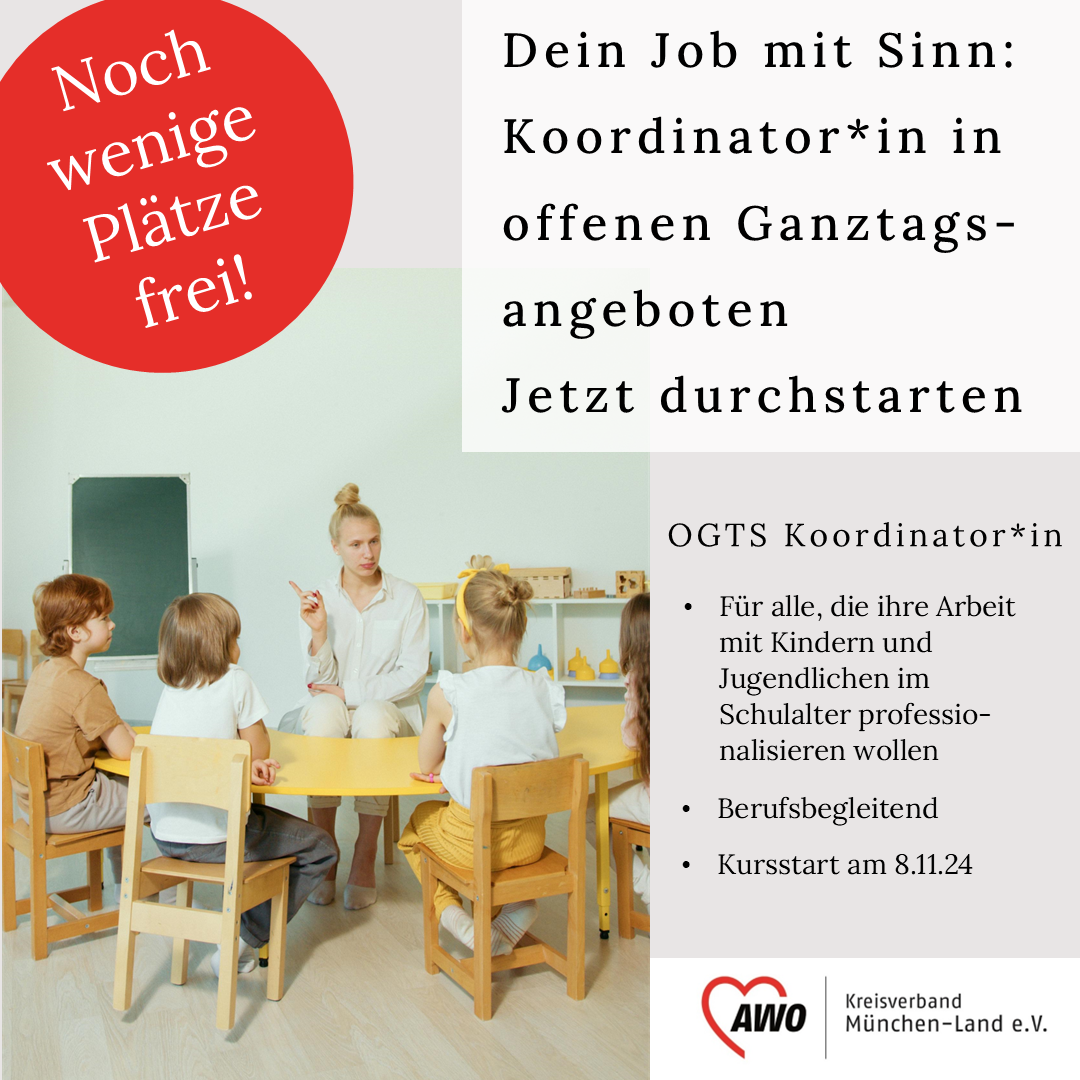 🤩 Am 8. November startet wieder unser Weiterbildungsangebot „Koordinator*in in offenen Ganztagsangeboten“. Wer bereits Erfahrung in der Arbeit mit Kindern und Jugendlichen im Schulalter gesammelt hat und sich weiterqualifizieren möchte, ist hier richtig! Alle Infos gibt‘s auf unserer Homepage unter „Weiterbildung“ oder im Link in der Bio – oder direkt bei Angela Bengel, Fachbereichsleitung Schule: angela.bengel@awo-kvmucl.de