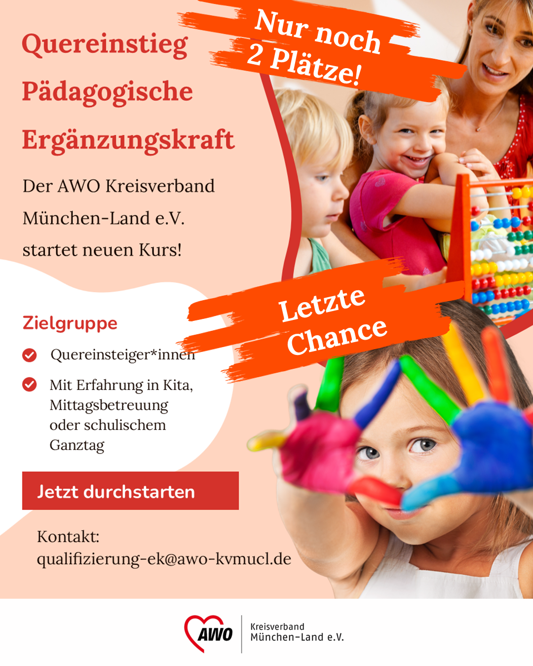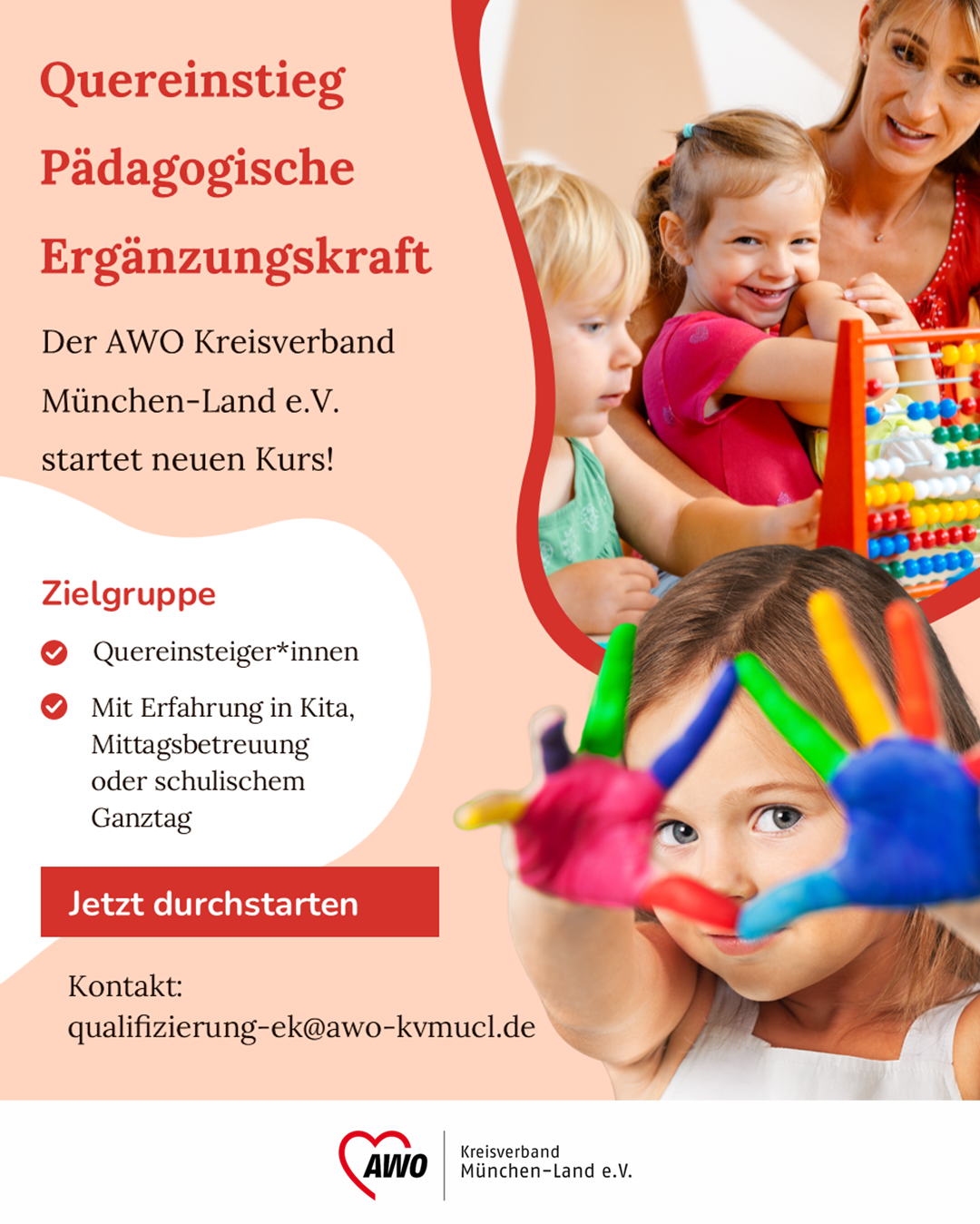 Wer schon immer mit Kindern arbeiten wollte 👶❤️, es bereits tut und dafür eine weitere Qualifizierung möchte oder schon eine Ausbildung in einem anderen Bereich hat und sich verändern möchte, ist hier richtig! Der AWO Kreisverband München-Land bietet diese Weiterbildungsmaßnahme zur Ergänzungskraft (Block B, Module 3+4) sowohl seinen Mitarbeiter*innen als auch externen Interessierten und Kooperationspartnern an. Weitere Infos gibt‘s auf unserer Homepage unter „Weiterbildung“. Ansprechpartnerin ist Angela Bengel. Kontakt: qualifizierung-ek@awo-kvmucl.de