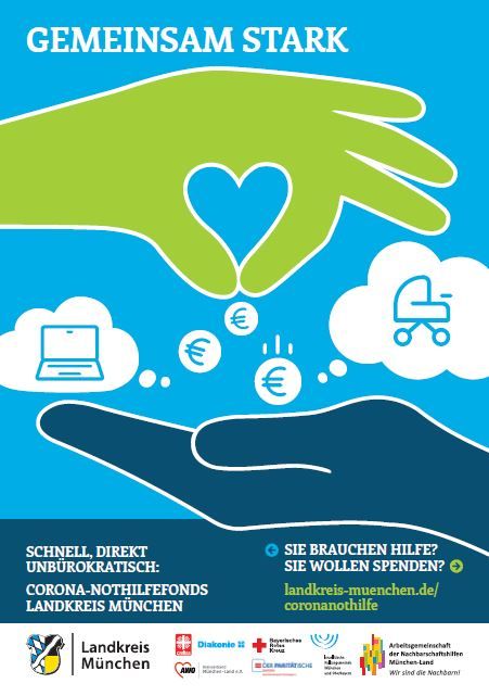 Der Corona-Nothilfefonds ist eine gemeinsame Aktion des Landkreises München, der Caritas Landkreis München, dem Arbeiterwohlfahrt Kreisverband München-Land e.V., des Paritätischen Bezirksverband Oberbayern, der Diakonie München und Oberbayern, des Bayerischen Roten Kreuzes Kreisverband München, der Israelitischen Kultusgemeinde München und Oberbayern und der Arbeitsgemeinschaft der Nachbarschaftshilfen im Landkreis München. Mehr Informationen gibt es auf der Homepage des Landkreises München unter www.landkreis-muenchen.de/coronanothilfe.